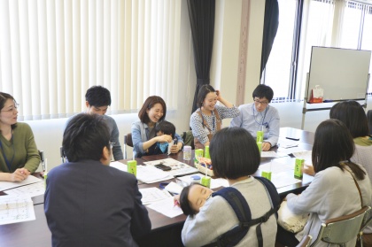 説明会後の交流会では、チームにわかれご家族の紹介をしてリラックスタイム。ワールドカフェ方式で、みなさんで意見を出し合いチームごとに発表していただきました。