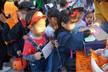 当日は27世帯のご家族、43名の子ども達が思い思いの仮装をして集まり、シールラリーからスタート。5軒ほどの家をシールを集めに回ります。全部集め終えたら、しっぽをつけた5人のパパたちを見つけて「トリックオアトリート!!」元気な声をだしてお菓子をもらいました。