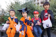 当日は27世帯のご家族、43名の子ども達が思い思いの仮装をして集まり、シールラリーからスタート。5軒ほどの家をシールを集めに回ります。全部集め終えたら、しっぽをつけた5人のパパたちを見つけて「トリックオアトリート!!」元気な声をだしてお菓子をもらいました。