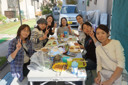 毎年恒例となっているご近所での秋バーベキュー交流会。お昼前にママ達で買い出しに行き、その間にパパ達でコンロの設置と準備万端です。