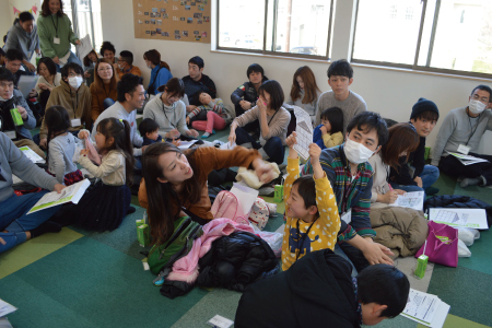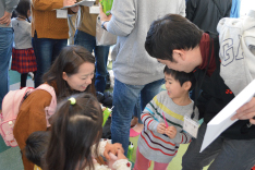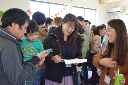 続いてお名前ビンゴ大会を開催。「はじめまして、○号棟の○○です。よろしくお願いします。」ご入居者同士お名前をお伺いして、ビンゴカードのマスを埋めていきます。パパ、ママに抱っこされた赤ちゃんのかわいらしさに微笑む場面も。途中、会場の熱気で窓を全開するほど大盛り上がり!