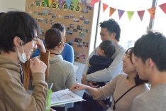 続いてお名前ビンゴ大会を開催。「はじめまして、○号棟の○○です。よろしくお願いします。」ご入居者同士お名前をお伺いして、ビンゴカードのマスを埋めていきます。パパ、ママに抱っこされた赤ちゃんのかわいらしさに微笑む場面も。途中、会場の熱気で窓を全開するほど大盛り上がり!