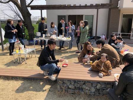 子どもたちはおいしく出来上がったご飯にニコニコ♪、大人たちも交流を深められ、担当営業の話題で盛り上がったり、野球好きのパパ同士でキャッチボールが始まったり、初春気持ち良い気候の中ゆっくりとしたひと時を過ごされていました。会終了後もご入居者の家に集合し、会の続きを楽しまれたご家族たちもいたようです。