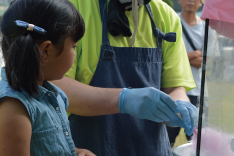 利きジュース大会で大はしゃぎする子どもたち。野田市のゆるキャラ”やど助”とのじゃんけん大会ではなんと子どもがTVを獲得しました。