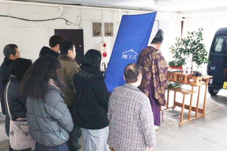 施主様とつながりが深い小岩神社により、最初に建物全体をビルトインの駐車場で、続いて店舗の神棚を丁寧にお祓いいただきました。