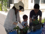 青空の下、季節の寄せ植えワークショップを開催。テーマは「サラダバスケット」。その名のとおり使用する植物はルッコラやタイム、ワイルドストロベリーなど全て食べられるものです。