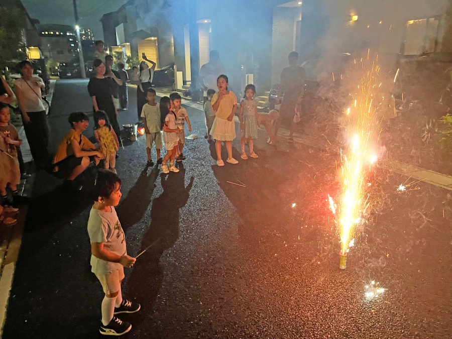 後半戦に入るところで雨が降ってきてしまい、屋外での分譲地対抗競技には参戦できませんでしたが、雨雲の切れ間に集合をして乾杯&花火を満喫♪大人も子どもも楽しみながら交流も深まった一日となりました。