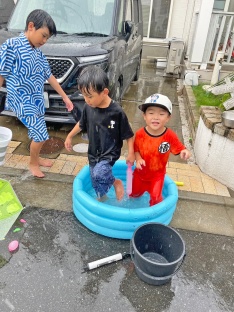 乾杯をして、ヨーヨーとスライムを作りながら楽しく過ごす子ども達。途中大雨に降られ、みんなびしょ濡れでしたが、それもまた楽しい♪みたいな雰囲気で楽しんでいました。