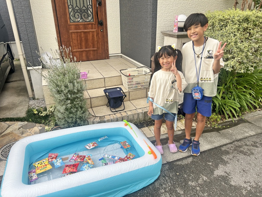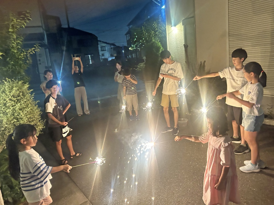 毎年恒例ということもあり、準備もスムーズ!予算を決め各家庭がそれぞれ夏祭りブースと景品を用意して、子ども達に各ブースのチケットを渡して楽しみました。日が暮れ始めたころに豪雨になってしまったので、花火大会は別日に開催して、手持ち花火のあと噴出タイプの花火で盛り上がりました。