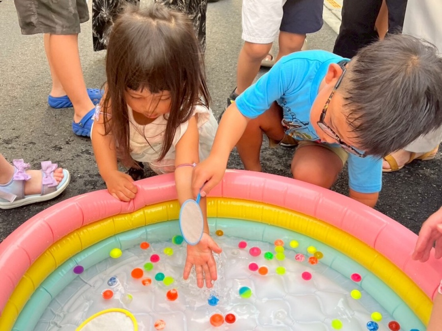 スーパーボールすくいや水風船大会などの縁日コーナーに加え、飲み物やおもちゃを使った「じゃんけん大会」も行われ、子どもたちは大喜び。好きな景品を選ぶ姿に、会場は笑顔と歓声に包まれていました。