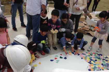 カラータイル貼りでは、職人さんの指導のもと子どもたちが思い思いにタイルを貼っていきました。庭木の植栽剪定講習会ではたくさんのご質問をいただくなど、みなさん植物やご自分のお庭に対し、ご興味をもって頂けた様子でした。